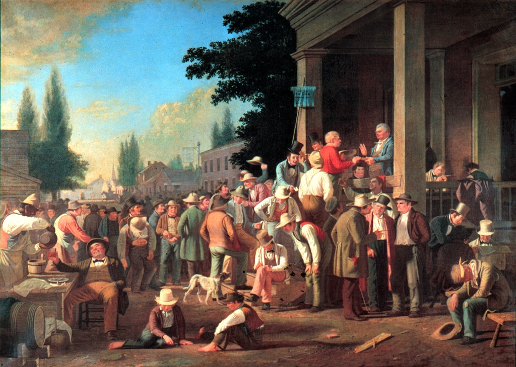 Here's a painting of American elections prior to the secret ballot: notice the voter in the red shirt being sworn in, verbally speaking his vote so the two people sitting in the back can record it (on redundant records maybe?) Notice the man on the left getting served an alcoholic beverage – almost certainly as payment for his vote.