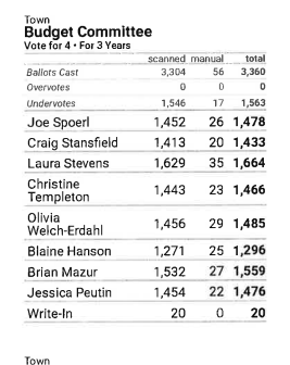 Two weeks ago, March 10th, 2026, was election day for towns across the state of New Hampshire. In the town of Goffstown, they had a contest for the Budget Committee, a vote for up to 4. Once the polls closed and all write-ins were adjudicated, the computed tally was very, very close. The candidate in fifth place was 2 votes behind the candidate in 4th place, 1476 to 1478. (PDF)